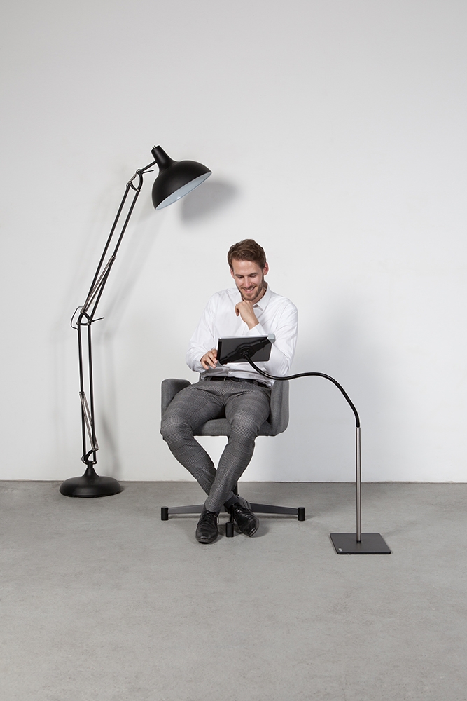 The new and exclusive tablet stand in minimalist design: easy to assemble, swivels fully, flexible, and very stable. The selected material combination of brushed stainless steel and finely textured matte surfaces lends the stand a high-end, elegant appearance.
